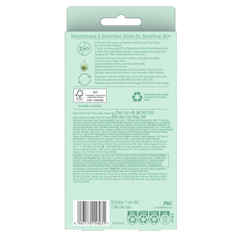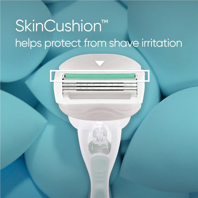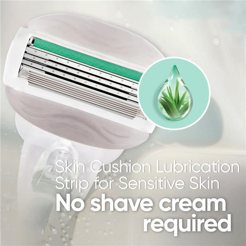 Gillette Venus female razor blades are designed with a woman's body in mind. Gillette Venus Comfortglide Sensitive women's razor blades feature 3 blades that give you a Venus-close shave and a built-in gel bars for 1 step silky skin. Comfortglide Sensitive also comes with a Skin Cushion Lubrication strip with a touch of Aloe Vera for glide. This helps deliver a smooth shave that ensures up to 0% irritation ensuring smoothness & seamless glide for sensitive skin. Simply add water for a skin-loving, light lather and a smooth shave-there's no need for separate shave gel, just wet & shave. From handles designed for a comfortable grip, to pivoting heads that contour to curves, Venus razors for women are designed to help reveal touchably smooth skin. Any Venus blade refill fits any Venus razor handle (except Simply Venus, Venus Soft, and Venus Pubic Hair & Skin Razor)? Shave your way without buying a whole new Venus handle.