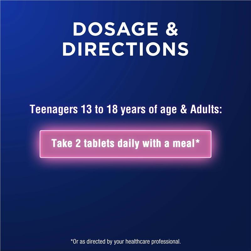 Suitable For: Teenagers 13 to 18 years of age: Take 2 tablets daily with a meal. Adults take 2 tablets daily with a meal. Or as directed by your healthcare professional.