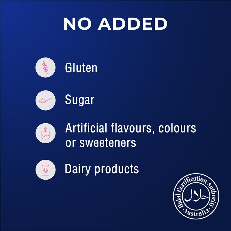 • NO ADDED: No added gluten, lactose, artificial colours, artificial flavours, artificial sweeteners, or dairy products