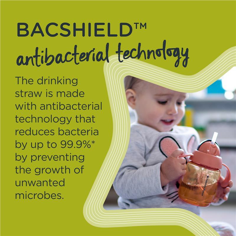 The drinking spout contains BACSHIELD™ antibacterial technology. BACSHIELD™ is a commonly used silver-ion technology that provides antibacterial product protection against unwanted bacteria, recognized for centuries with no harmful effects. It works by preventing the growth of unwanted microbes that can cause product degradation, discoloration, staining or odor. This is achieved with silver ions mixed in the material on the straw*, preventing microbes from multiplying.